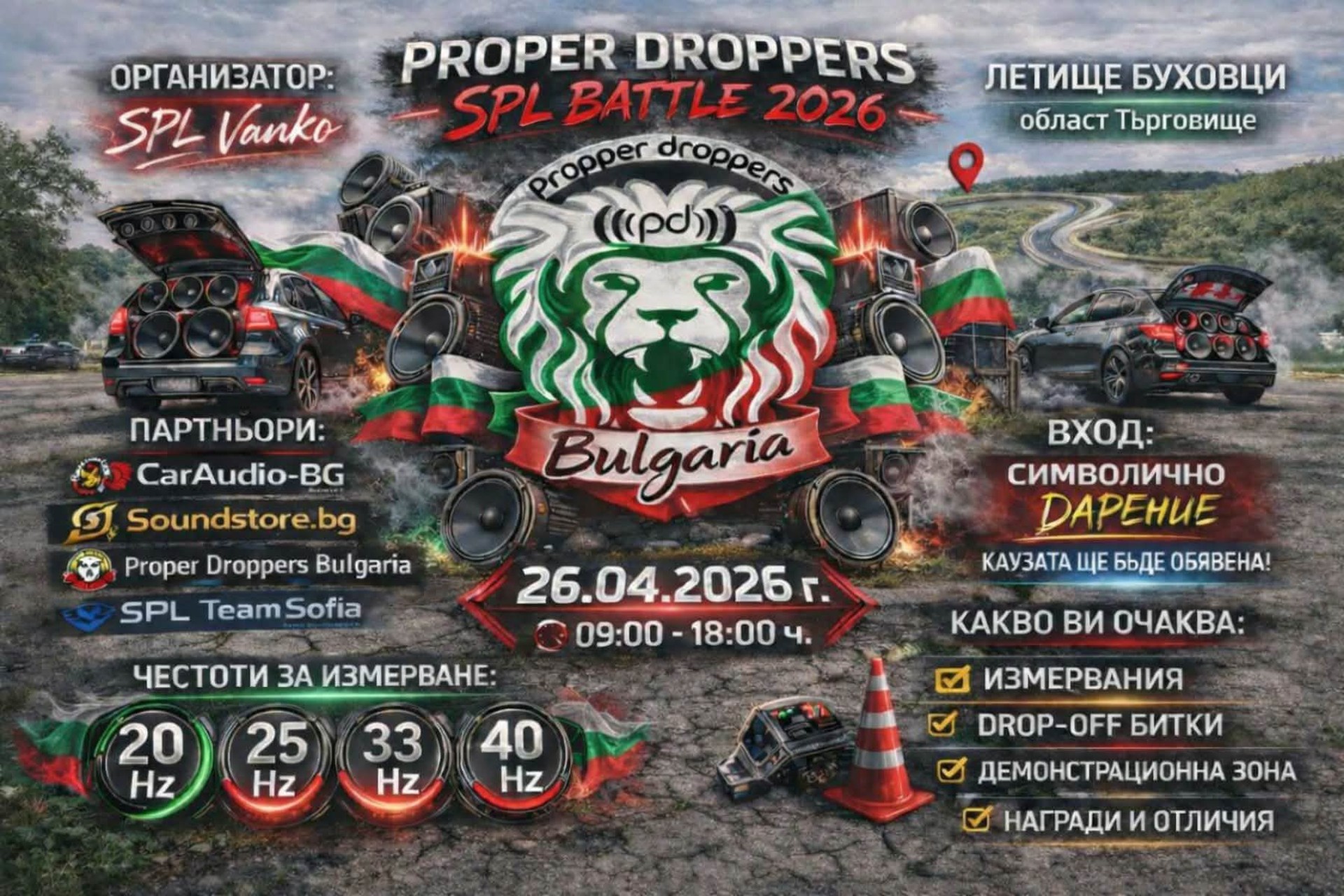 Подготви се за ден, изпълнен с брутално звуково налягане, хард бас и истинско автомобилно аудио шоу! На летище Буховци ще се съберат едни от най-силните системи в страната, готови да премерят сили в Proper Droppers формат.